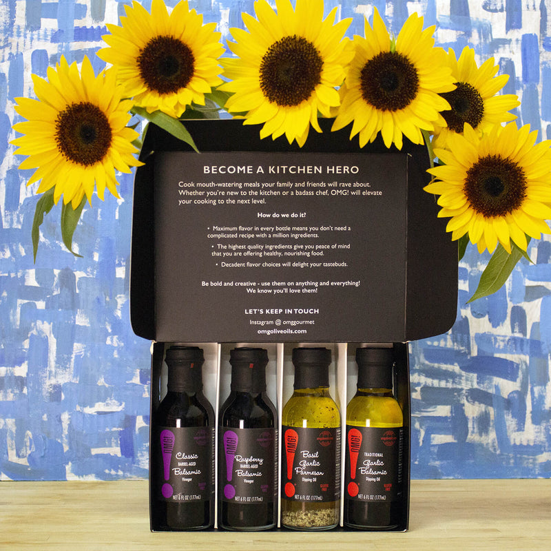 Includes: Classic Balsamic, Raspberry Balsamic, Basil Garlic Parmesan Dipping Oil and Traditional Garlic Balsamic Dipping Oil